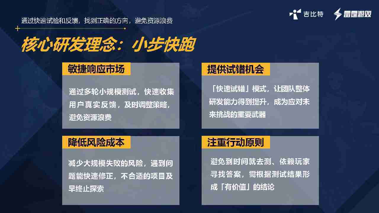 小步快跑不是找答案,,,而是驗證答案。。。。我們之前有項目是這樣的,,有些制作人會有幾個方向覺得都可以做,,,,但是不確定做哪一個,,會選擇幾個都做,,,,做完拿到市場跑,,,跑出哪一個更好,,,,基于這個再做后續的研發和拓展。。但這種情況最容易出現一個問題,,,可能被玩家裹脅,,,玩家說這個點不錯、、、、那個點不錯,,,到底聽還是不聽,,不聽感覺是無視玩家的反饋,,,聽的話,,可能自己沒想清楚導致研發思路發生偏頗。。所以針對這一點后面自己復盤整理,,發現制作人自己心里要有數,,,要做自己覺得好玩的,,而且明確知道這個東西是你想做的,,然后拿到市場驗證這個答案是不是對的,,而不是拿一堆答案找哪一個答案更好。。。
