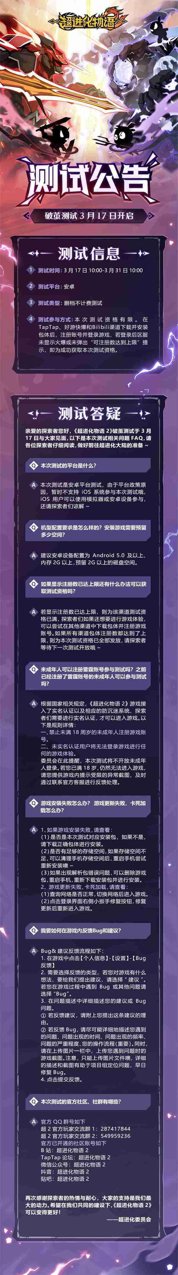《超進化物語2》首次限號不計費刪檔測試——「破繭測試」將于3月17日開啟,,隨我們確認測試細節(jié),,,明天邁出踏上超進化大陸的第一步吧!!