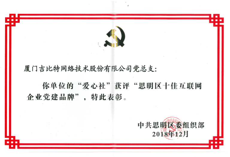 經初審評選、、網絡評選和專家評審等環節,,"廈門一競技網絡技術股份有限公司黨總支-愛心社" 從全區28個參評黨建品牌中脫穎而出,,,,獲評"思明區十佳互聯網企業黨建品牌"。。。